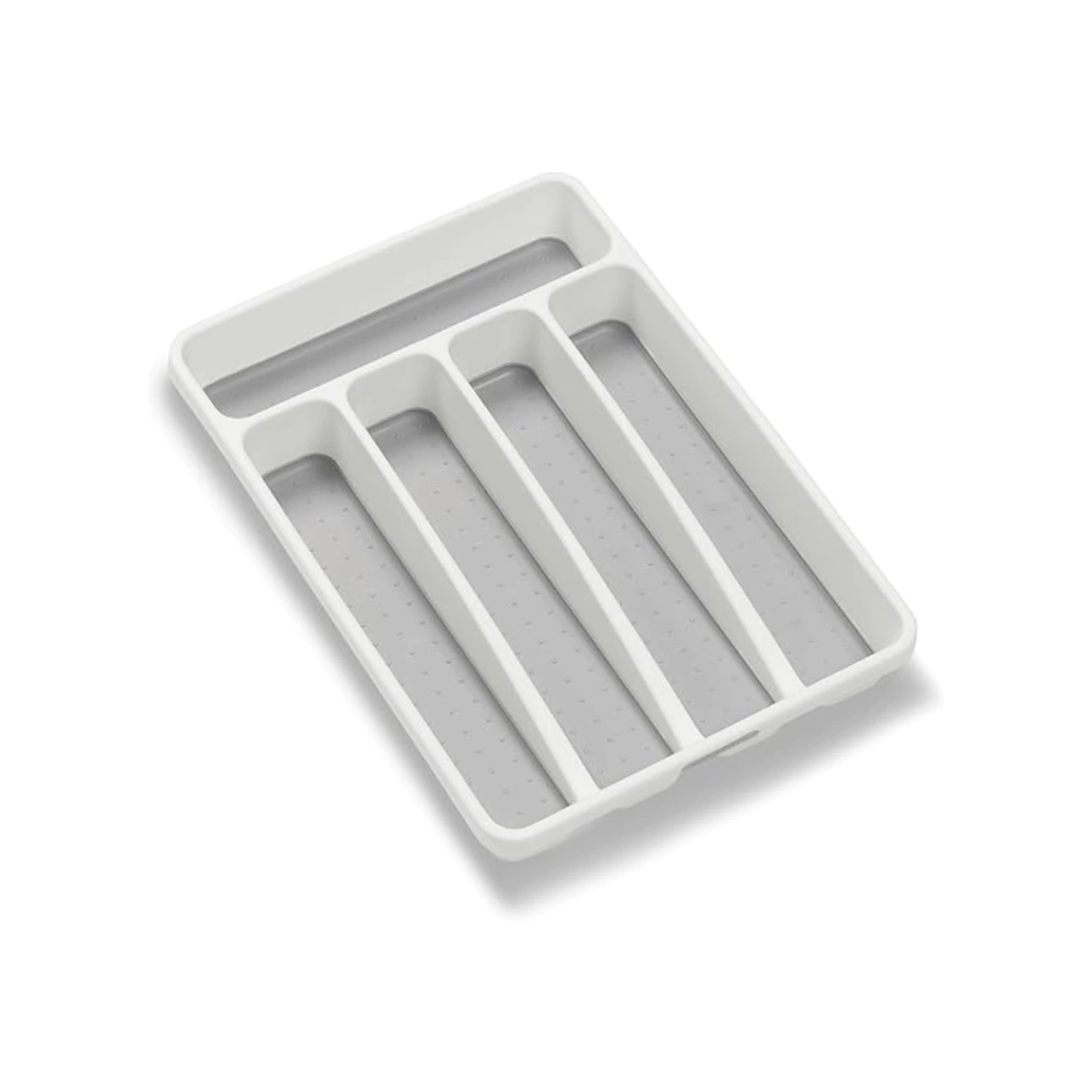 La bandeja para cubiertos pequeña en color blanca organiza los cubiertos en cinco compartimentos diseñada para adaptarse a cajones pequeños. Cuenta con esquinas redondeadas para facilitar la limpieza, forro antideslizante gris y topes de goma antideslizantes para mantener las cosas en su lugar. Hecho de plástico de alta calidad sin BPA.