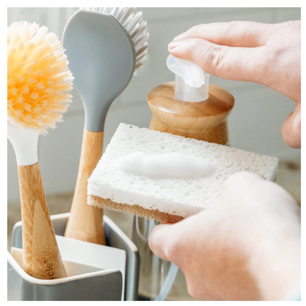 Dispenser de vidrio gris para jabón o detergente, con materiales ecológicos, que dosifica la cantidad a utilizar.